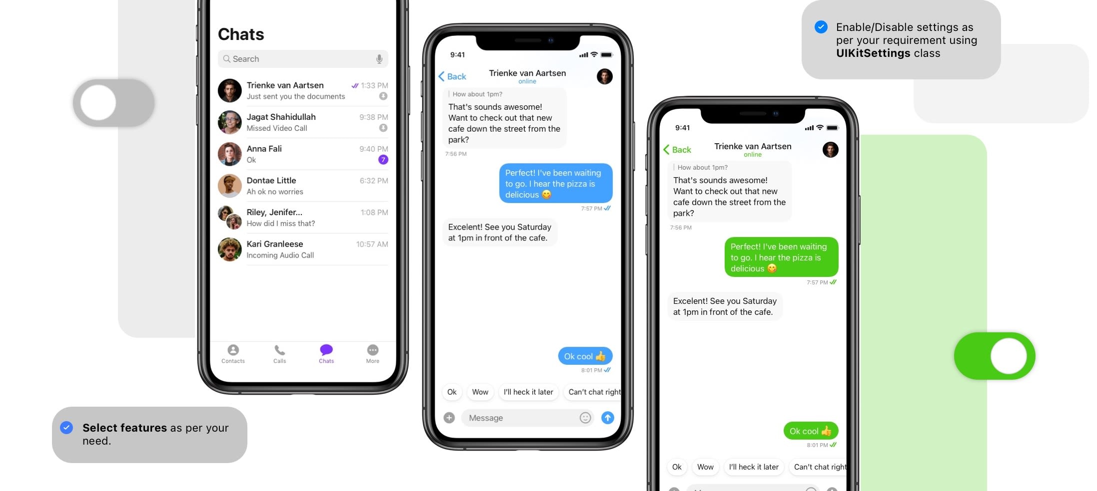 | 16. | Ability to reply on message | UIKitSettings.replyToMessage = .enabled | You can show it using .enabled or hide it using .disabled. |